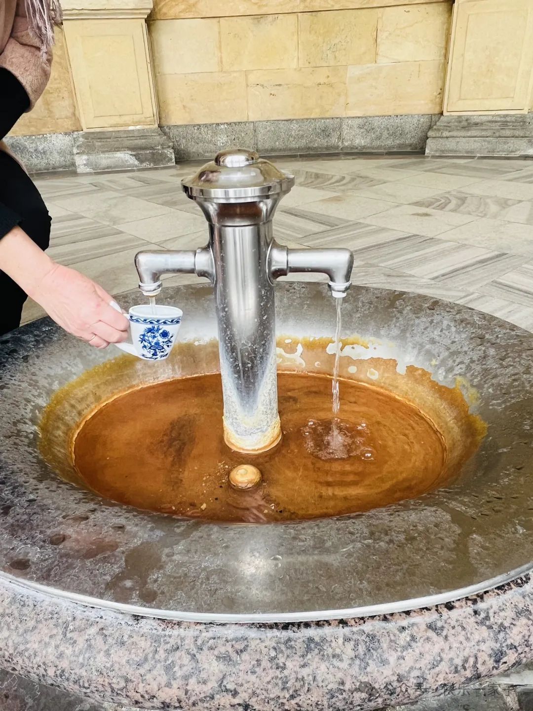 共有四道温泉回廊,第一个是现代式(加加林式),温泉温度高达72度,喷出来的温泉高达数米,可见其压力之大。其他有洛可可温泉回廊,磨坊温泉回廊等等,有的精致,镂空雕刻如工艺品;有的壮观,不同凡响。在每一处都可用杯子接温泉品尝,温度高低各不相同。