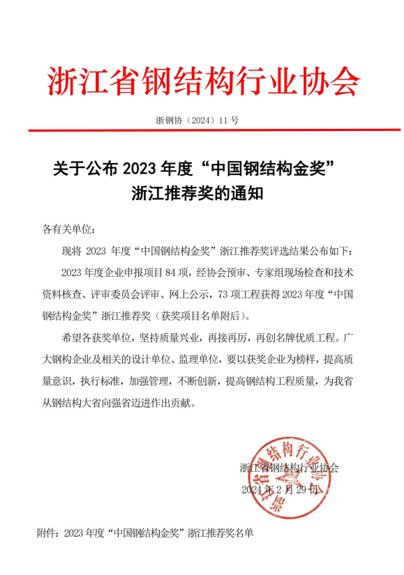 近日,浙江省钢结构行业协会公布了2023 年度“中国钢结构金奖”浙江推荐奖评选结果,由杭萧钢构股份有限公司施工的丽水国际会展中心项目获此殊荣。该奖项是浙江省钢结构工程最高奖项。