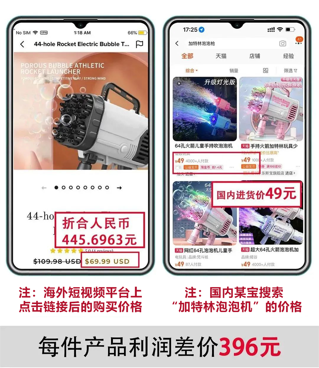 就拿之前在海外Dǒu 音上大火的加特林泡泡机来说,某宝上卖49元,在海外Dǒu 音上卖400多人民币!!
