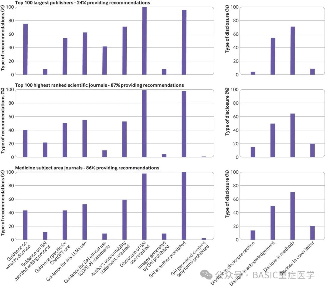 Results Among the top 100 largest publishers, 24% provided guidance on the use of GAI, of which 15 (63%) were among the top 25 publishers. Among the top 100 highly ranked journals, 87% provided guidance on GAI. Of the publishers and journals with guidelines, the inclusion of GAI as an author was prohibited in 96% and 98%, respectively. Only one journal (1%) explicitly prohibited the use of GAI in the generation of a manuscript, and two (8%) publishers and 19 (22%) journals indicated that their guidelines exclusively applied to the writing process. When disclosing the use of GAI, 75% of publishers and 43% of journals included specific disclosure criteria. Where to disclose the use of GAI varied, including in the methods or acknowledgments, in the cover letter, or in a new section. Variability was also found in how to access GAI guidelines shared between journals and publishers. GAI guidelines in 12 journals directly conflicted with those developed by the publishers. The guidelines developed by top medical journals were broadly similar to those of academic journals.