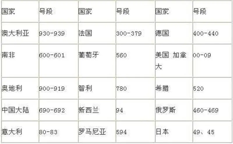 条形码上面的数字不是随便写的,每个数字都有它代表的含义,我们可以通过条形码前三个数字来确定红酒的原产地。比如以69开头的红酒就在国内灌装的,小编整理一些红酒原产国条形码的前缀,如下图所需。