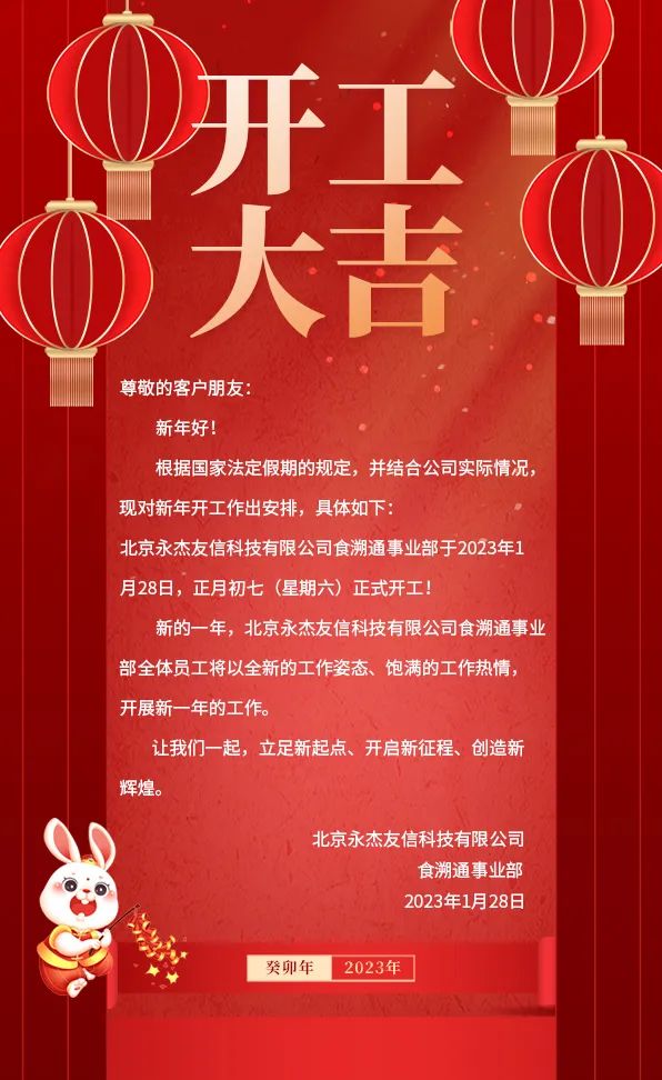 北京永杰友信科技有限公司食溯通事业部2023年开工通知