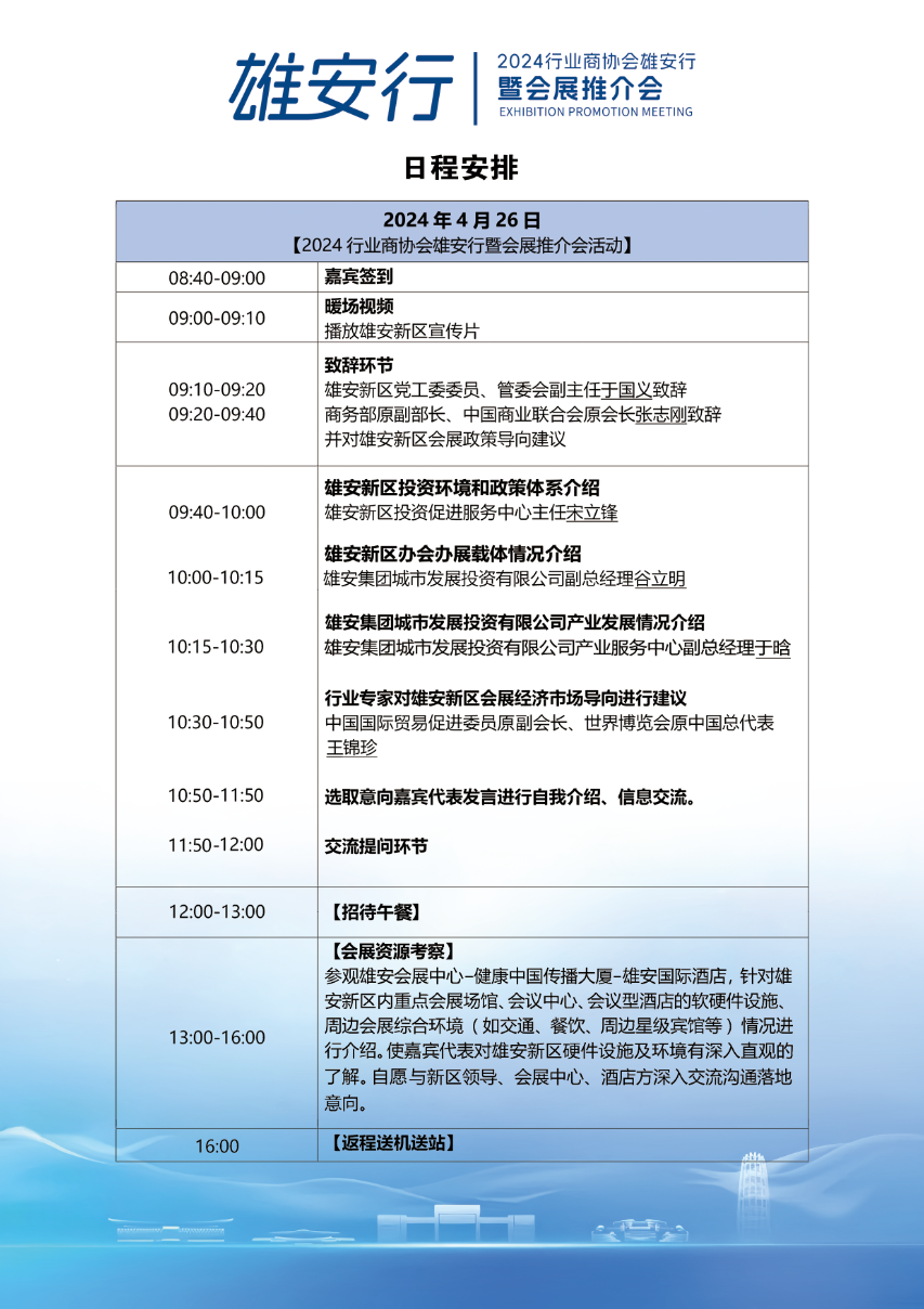 本次洽谈会特邀符合雄安新区新一代信息技术、现代生命科学和生物技术产业、新材料产业等重点产业的流动性会议展览的全国性行业协会、迁入新区的相关产业会议会展。重点发布雄安新区会展业相关支持政策、介绍雄安新区会展环境,集中展现雄安在举办企业会议、总部会议、文化论坛、节庆赛事方面的优越性;使会议展览主办方全方面了解雄安新区会展业办展办会的硬件设施和软件服务能力。