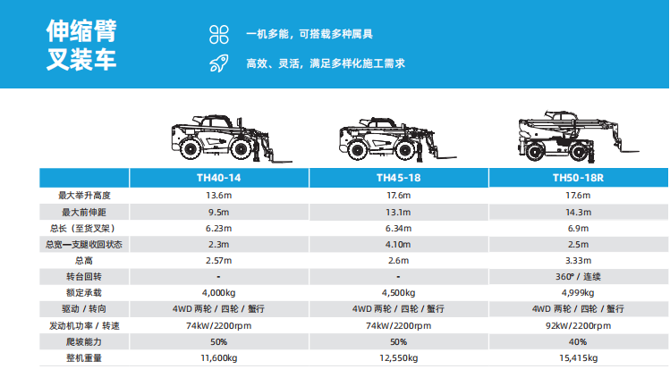 伸缩臂叉装车按作业用途可分为农业型、建筑型和重载型,租赁市场比较常用的是建筑型,分为固定式和旋转式。