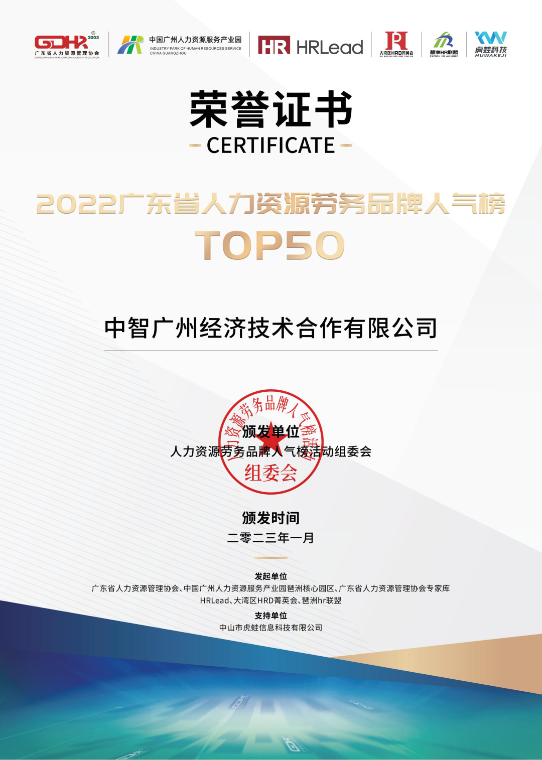 近日,中智广州作为区域内品牌影响力出众的综合性人力资源服务机构,获得“2022年度人力资源服务品牌机构”和“2022广东省人力资源劳务品牌人气榜TOP50”榜首两项殊荣。