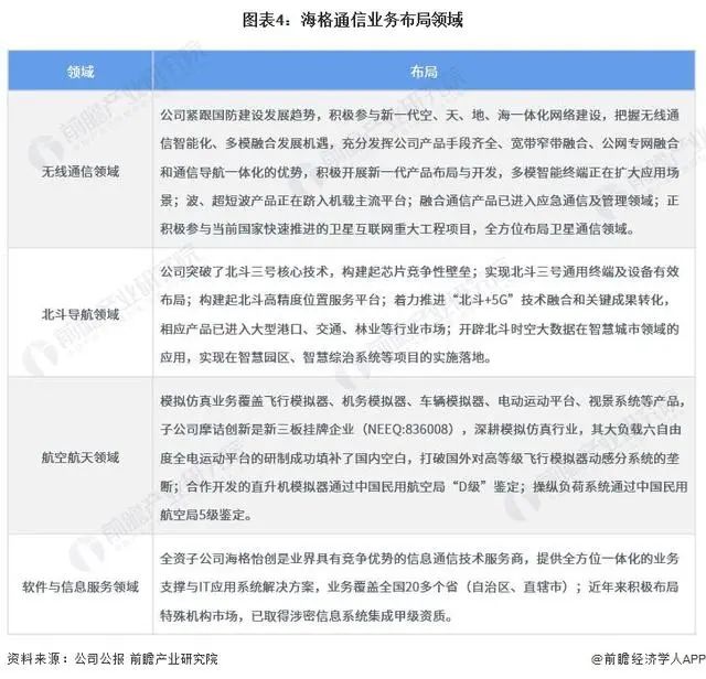 海格通信主要业务覆盖“无线通信、北斗导航、航空航天、软件与信息服务”四大领域。在无线通通信领域,公司是无线通信装备种类最全的单位之一;在北斗导航领域,公司率先实现“芯片、模块、天线、终端、系统、运营”全产业链布局,是“北斗+5G”应用先行者;在航空航天领域,公司是国内机构市场模拟仿真系统领导者,是国内首家为机构客户提供“D级”模拟器的供应商。