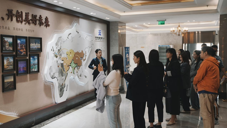 跟随着工作人员的脚步,大家走进了展销中心,作为红酒进口贸易的重要口岸,东疆汇聚了世界各地的优质红酒,也积累了丰富的红酒贸易经验。工作人员详细介绍了东疆的区域特点,以及红酒的历史、种类、产区以及酿造工艺,让大家对区域红酒文化有了更深入的了解。