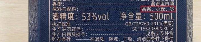 举个简单的例子,这款酒就是正宗的纯粮食酒。我们可以看它的原料表,只有高粱、小麦和水,所以是十足的粮食酒。另外可以看执行标准,GB/T26760-2011是我国酱香型白酒的执行标准。
