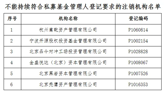 协会将注销该6家机构的私募基金管理人登记。已注销的私募基金管理人和相关当事人,应当根据法律法规、证监会规定以及协会相关自律规则、基金合同约定,妥善处置在管基金财产,依法保障投资者的合法利益。