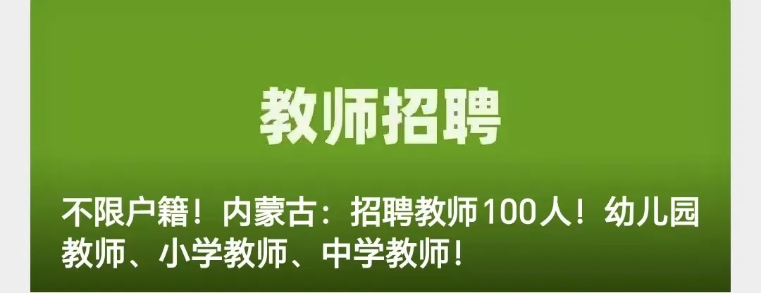 ➤点击查看:不限户籍!内蒙古:招聘教师100人!幼儿园教师、小学教师、中学教师!!