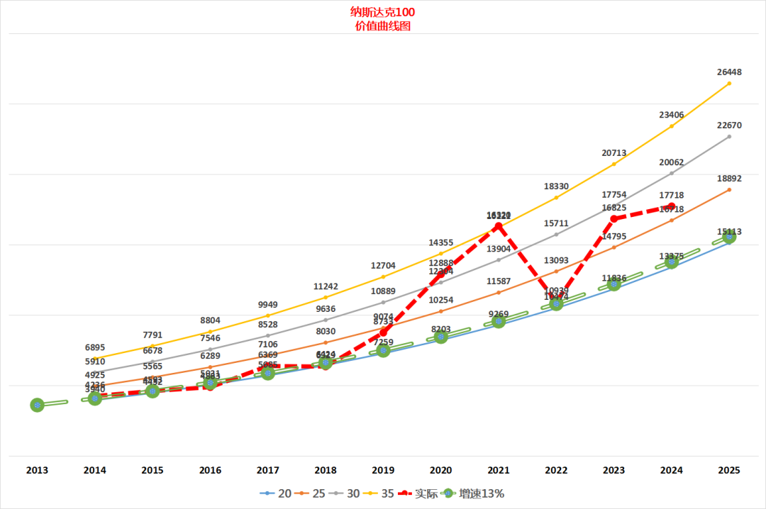 因此针对纳斯达克100指数,其实直接选用十年复合年化13%的价值曲线,会更容易看清楚纳指所处的位置。