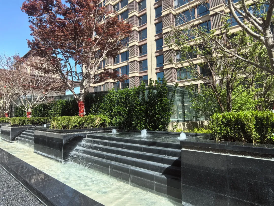 小区以轴线和开敞空间构成层次丰富的空间序列,收放交错,开合有致,采用轴线、纵横、高低、隐置、对景法, 使小区内各点互为借衬,有机和谐,烘托出尊贵、典雅的小区气氛。 结合36-57米的超大楼间距,打造带状楼间绿化组团,保证每栋楼的 观景视线。植物配置四季长青,三季有花,月月有景,景景宜人。