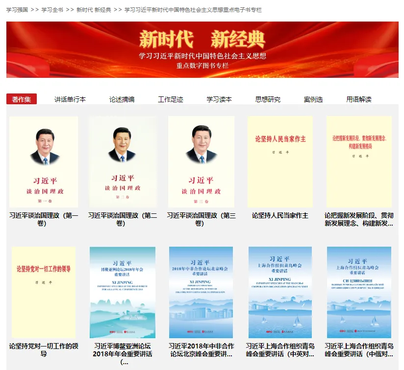 如果想要学习习近平新时代中国特色社会主义思想,还可以直接进入“新时代 新经典”栏目,这里收录了著作集,单行本,论述摘编,读本类,思想研究、学习体会,语言典故,生活经历等多种数字图书。