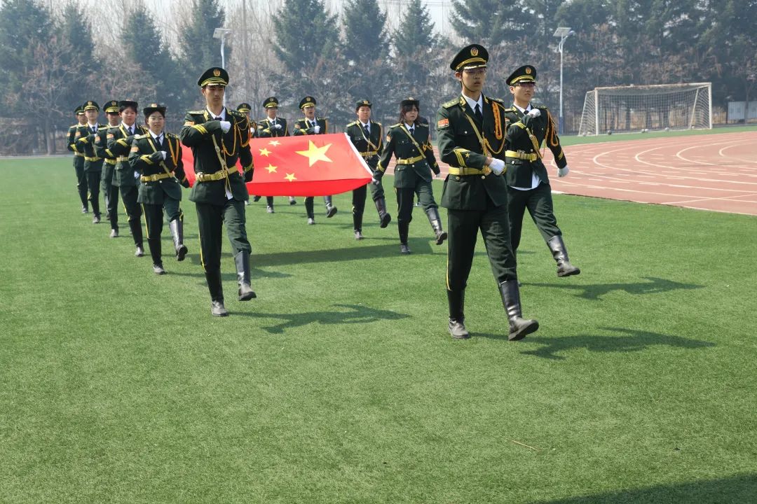 升旗队员们身着升旗礼服走来了,看,他们英姿飒爽,自信昂扬,以青春的姿态,迈着矫健的步伐,护送着庄严的五星红旗走到升旗台前。
