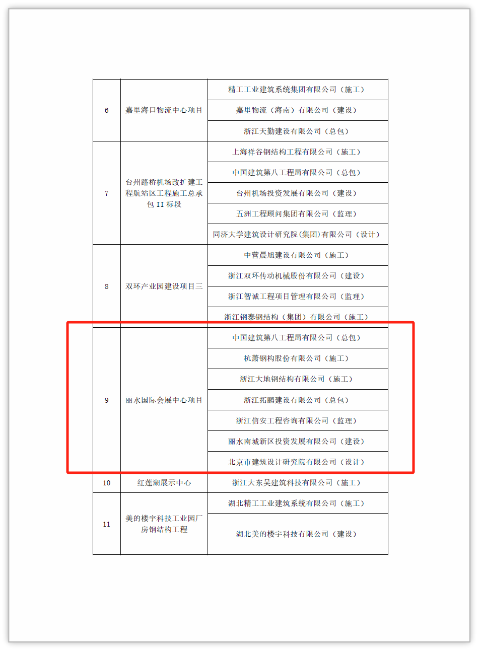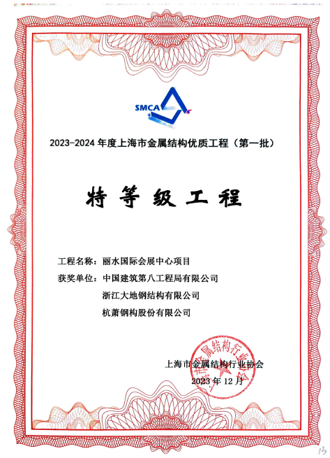 日前,由集团公司投资建设的丽水国际会展中心项目同时获得“上海市金属结构优质工程特等级工程(金钢奖特等奖)”及“2023年度‘中国钢结构金奖’浙江推荐奖”荣誉称号。值得一提的是,上述奖项分别为上海市钢结构工程质量最高奖项与浙江省钢结构行业含金量最高奖项,未来,该项目还将代表浙江省冲刺国家级荣誉——“中国钢结构金奖”。