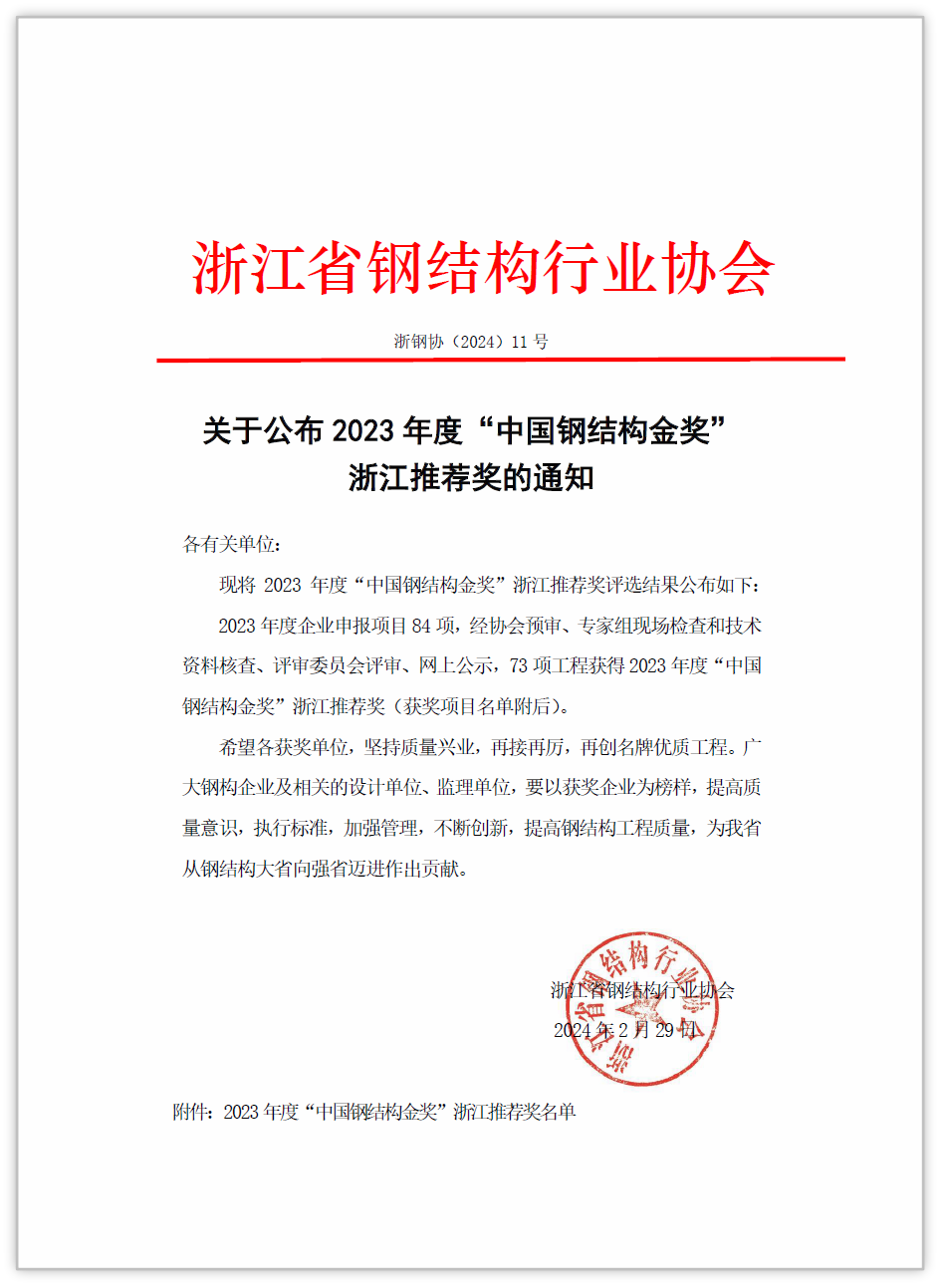 本次奖项的获得是上海市金属结构行业协会和浙江省钢结构行业协会对该项目建设的极大肯定,充分展示了集团公司在工程管理、技术水平以及质量管控等方面的综合实力。集团公司将珍惜荣誉,再接再厉,进一步提升项目管理水平,狠抓质量安全,打造更多精品工程。
