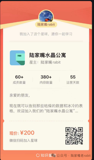 我最近刚开了知识星球,加入可拉群,里面有千万牛散,十亿私募以及新财富研究员。知识星球的优点是每天可以不限发文次数 ,大家自由评论,支持文件分享、音频上传,我每天分享数据分析截图 ,明天的操作计划,调研报告等比公众号更方便,不为赚钱只是扩大认知圈。大家可以试试看,里面内容是你看不到或者未必买得到的。