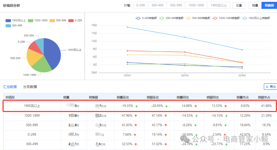 从各个价格段的销售数据来看,1900元以上的价格段占据市场的领先地位。这部分市场销售额累计接近40亿元,市占比高达42%。同时,该价格段销量和销额均实现了同比增长,销量同比增长15%,销额同比增长了14%。