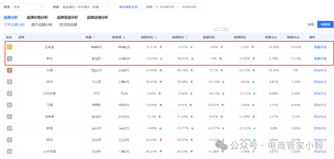 茅台虽然在今年第一季度面临一些挑战,但消费者对其消费需求依然旺盛。鲸参谋数据显示,茅台销售额累计16.2亿元,市占比由去年不足15%上升到了今年的17%。