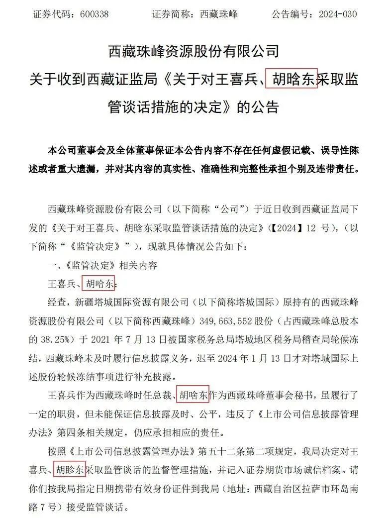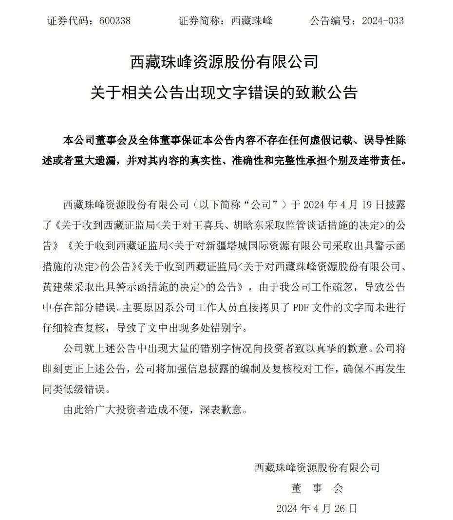 △4月18日晚,西藏珠峰发布的公告,将董秘名字连续写错三次。截图自上交所。上市公司披露的公告原本应严肃、严谨,却出现了如此低级的错误,这也引起了监管部门的注意。4月25日,西藏证监局对西藏珠峰发出警示,其中,《关于对西藏珠峰资源股份有限公司、黄建荣、胡晗东采取出具警示函措施的决定》指出,西藏珠峰的上述《公告》存在多个错别字,反映出公司信息披露内控流于形式,违反了《上市公司信息披露管理办法》第三条第一款相关规定。西藏证监局认为,黄建荣作为西藏珠峰董事长,胡晗东作为西藏珠峰董事会秘书,未能忠实、勤勉地履行职责,按照相关规定,西藏证监局决定对西藏珠峰、黄建荣、胡晗东采取出具警示函的监督管理措施,并将相关情况记入证券期货市场诚信档案。同日,上交所也对西藏珠峰发出了监管警示,表示由于西藏珠峰工作疏忽,导致多份公告中出现低级文字错误,造成较大影响,上交所决定对西藏珠峰及董事会秘书胡晗东予以监管警示。对此,西藏珠峰于26日连发致歉和更正公告。西藏珠峰在致歉公告中表示,写错董秘名字的主要原因是公司工作人员直接拷贝了PDF文件的文字而未进行仔细检查复核,导致了文中出现多处错别字。