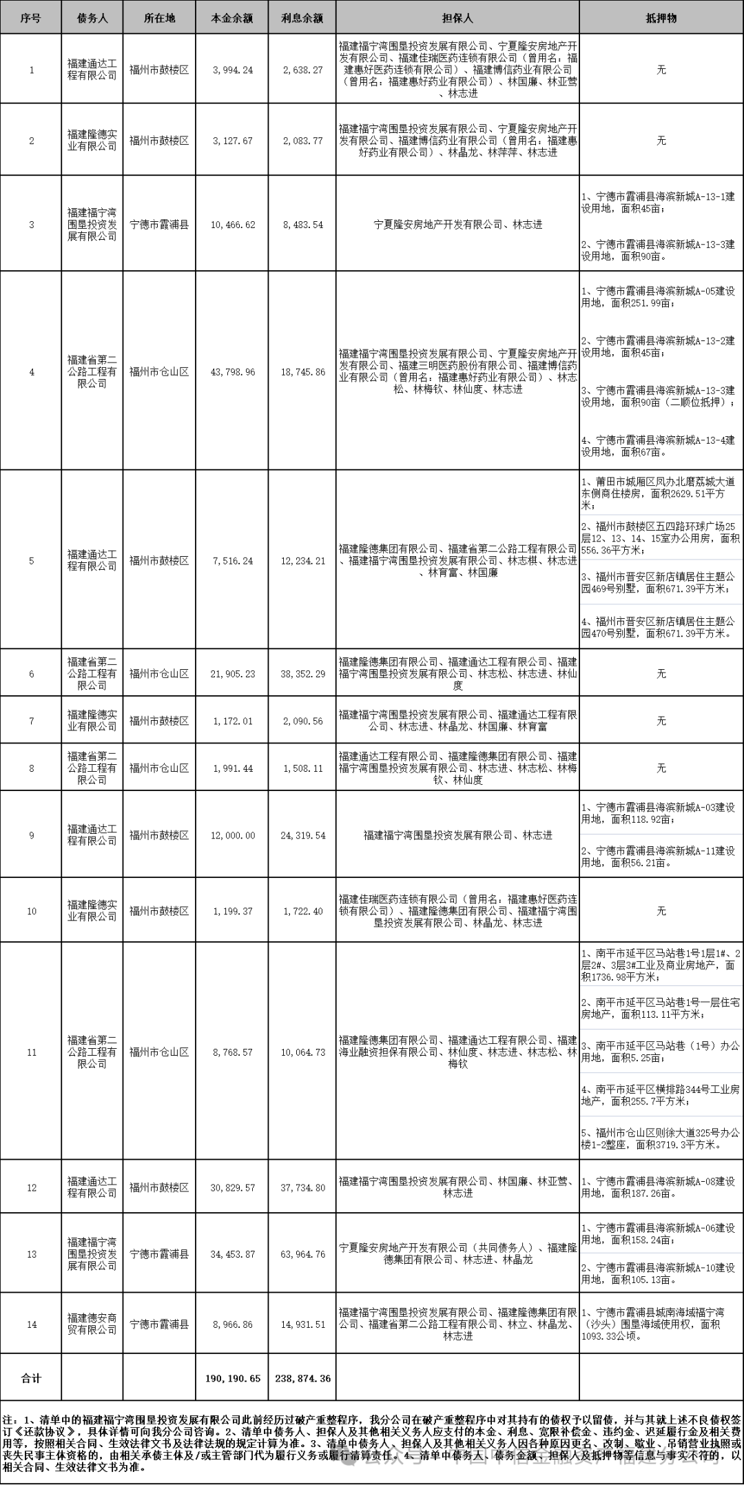 截至2024年4月20日,上述不良债权合计人民币429065.01万元,其中本金190190.65万元,利息238874.36万元。明细情况如下: