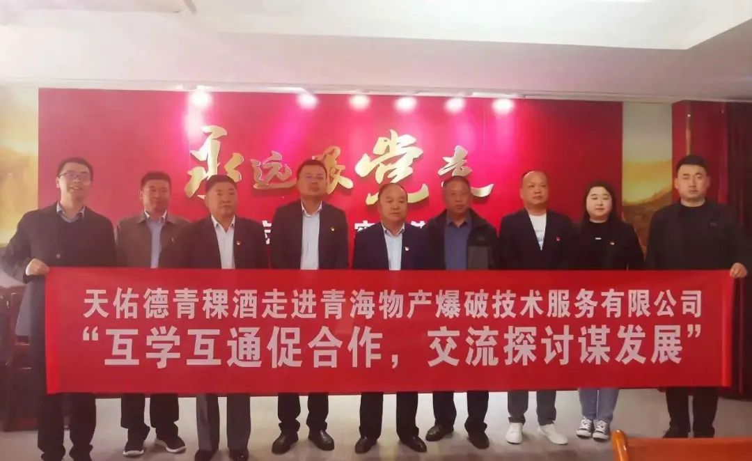 4月27日上午,天佑德青稞酒公司走进青海物产爆破技术服务有限公司,开展以“互学互通促合作,交流探讨谋发展”为主题的党建交流活动。青海物产爆破技术职业培训学校党支部副书记、副总经理李启航,总经理助理牛全民,工程部经理吴晓东,市场开发部经理杨建才,党务工作者刘阳;互助县委派驻天佑德青稞酒公司党委第一书记陈得锴,营销中心团购部经理孙永吉、主管徐永生、天佑德品牌讲解师罗公平共同参加了此次交流活动。