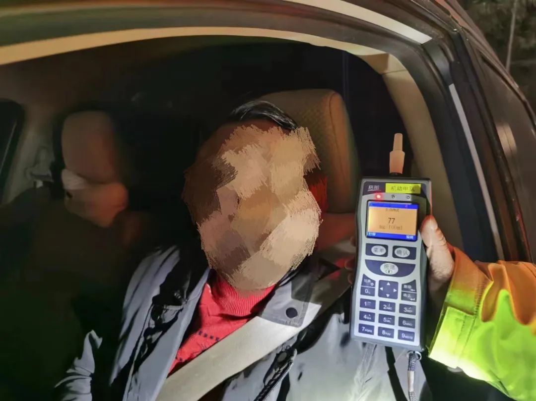 当晚21时47分,执勤人员遇到一辆粤E小型普通客车迎面驶来,例行对司机曾某例行呼气式酒精检测,结果显示其体内酒精含量为77mg/100mL,驾驶人曾某是酒驾行为,依法对驾驶人曾某,罚款2000元、记12分、暂扣驾驶证6个月的处罚。