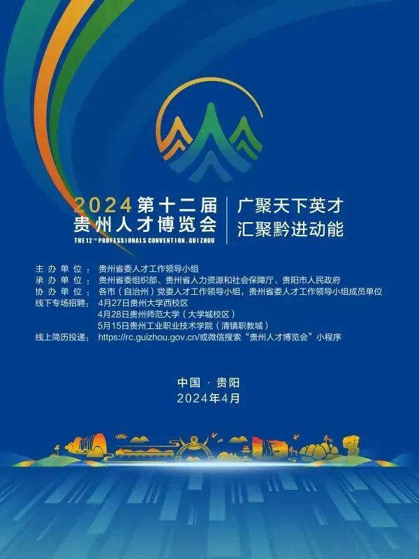 贵州人才博览会(简称“人博会”),是贵州省委人才工作领导小组主办,中共贵州省委组织部、贵州省人力资源和社会保障厅、贵阳市人民政府承办的省级人才交流活动。大会举办期间,集中举办人才发展研讨会、人才集中公开招聘、人才工作集中展示、人才发展政策宣传等活动。邀请国家有关部委、知名高校、有关协会负责人,国内外知名专家、学者、科研人员,海内外高层次人才、国内外创新创业团队、创新创业项目代表作为嘉宾参与活动。从2013年起,已连续举办十一届,今年第十二届贵州人才博览会于2024年4月27日—28日举办。二、承办单位:中共贵州省委组织部、贵州省人力资源和社会保障厅、贵阳市人民政府央企、省级(含贵阳贵安)企事业单位招聘活动暨国聘行动专场招聘会1.4月27日10:30-16:00 贵州大学西校区足球场2.4月28日10:30-16:00 贵州师范大学(大学城校区)3.5月15日10:30-16:00 贵州工业职业技术学院(清镇职教城)线上平台地址:https://rc.guizhou.gov.cn;微信公众号、微信小程序:微信搜索“贵州人才博览会”即可进入。欢迎您参与第十二届贵州人才博览会,就业贵州、助力贵州、建设贵州!编辑:陈柏宇