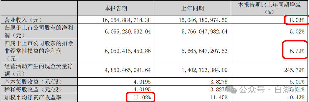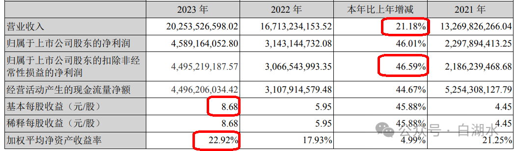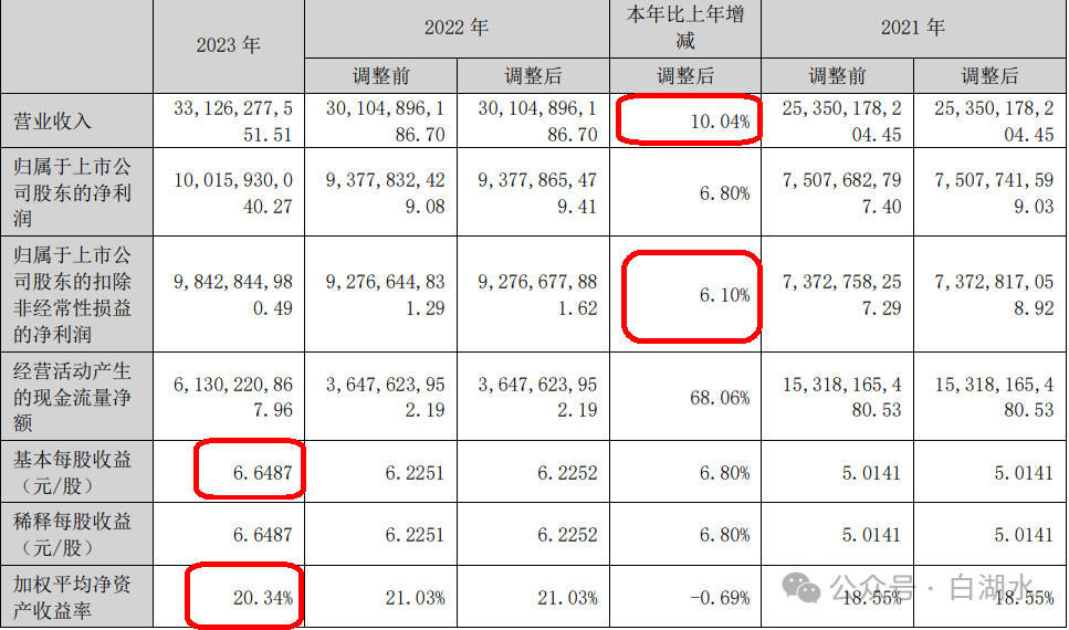 点击上方【白湖水】→点击右上角【▪▪▪】→点击【设为星标】★,方便查找,不错过信息。我持有贵州茅台、泸州老窖、洋河股份共三支白酒股票,打算以后买入古井贡B股票。白酒股票是我第一重仓的板块,贵州茅台是第一重仓的股票,所以对白酒股票的学习和跟踪最为紧密,这个周末,都出了2023年报和2024一季报,学习跟踪公司的经营情况。营业收入增长10%,从300亿增长到330亿,很好! 扣非净利润增长6%,还行。问题是利润的增长幅度小于营业收入的增长幅度。年度分红每股4.66元,分红比例是4.66/6.65=70%。按照现在的股价100元估算,股息率为4.6%。股息率高于茅台,也高于老窖(老窖的股息率是3%)。看完年报摘要,感觉就是符合预期。市场先生非常聪明,给予洋河PE15,就是已经算到了洋河的成长率为个位数。果然成长率是6%。按照【PE=10+成长率】的估值公式,成长率为6%,PE=16。当前的市盈率15倍完全符合估值公式,一点不高,一点不低。四季度净利润是负数。这是在洋河历史上和名牌白酒历史上,几乎没有出现过的事情。这次洋河的年报出来后,市场反应很大,认为洋河业绩很差!要清仓洋河。的确洋河是几大名酒中表现最差的,无论是业绩还是股价。四季度经营现金流净额是18亿,但是净利润是-3亿。为什么净利润会是-3亿,我没有细看财报。一来没有时间,二来觉得没有那么重要。也许公司进行了利润调节,把四季度的利润隐藏起来,调节到2024年? 一季报结论:总体上符合预期,营业收入和净利润增速保持稳定。营业收入增长8%,净利润增长6.8%。ROE11%。注意去年的ROE只有20%,今年一季度就有11%,已经超过去年整年度的一半了。所以一季度很重要。公司把去年的利润调节到今年,维持增速稳定,也是可能的。也是白酒行业常用的财报技巧。公司可能知道自己的业绩不好,比其他几个白酒公司都差,股价萎靡不振。所以今年增加了分红率,达到了70%,已经超过了分红王泸州老窖的60%。目前的股息率为4.6%。4%的股息率+6%的成长率,年化回报率10%,及格了。今天开盘竞价时,看到群里说洋河跌停了。我委托出100张可转债,如果洋河开盘真跌停,我就加一手洋河,正好把今年100元以上减持的一手加回来。结果洋河没有跌停,我没有增持成功。100元减仓洋河的记录如下: