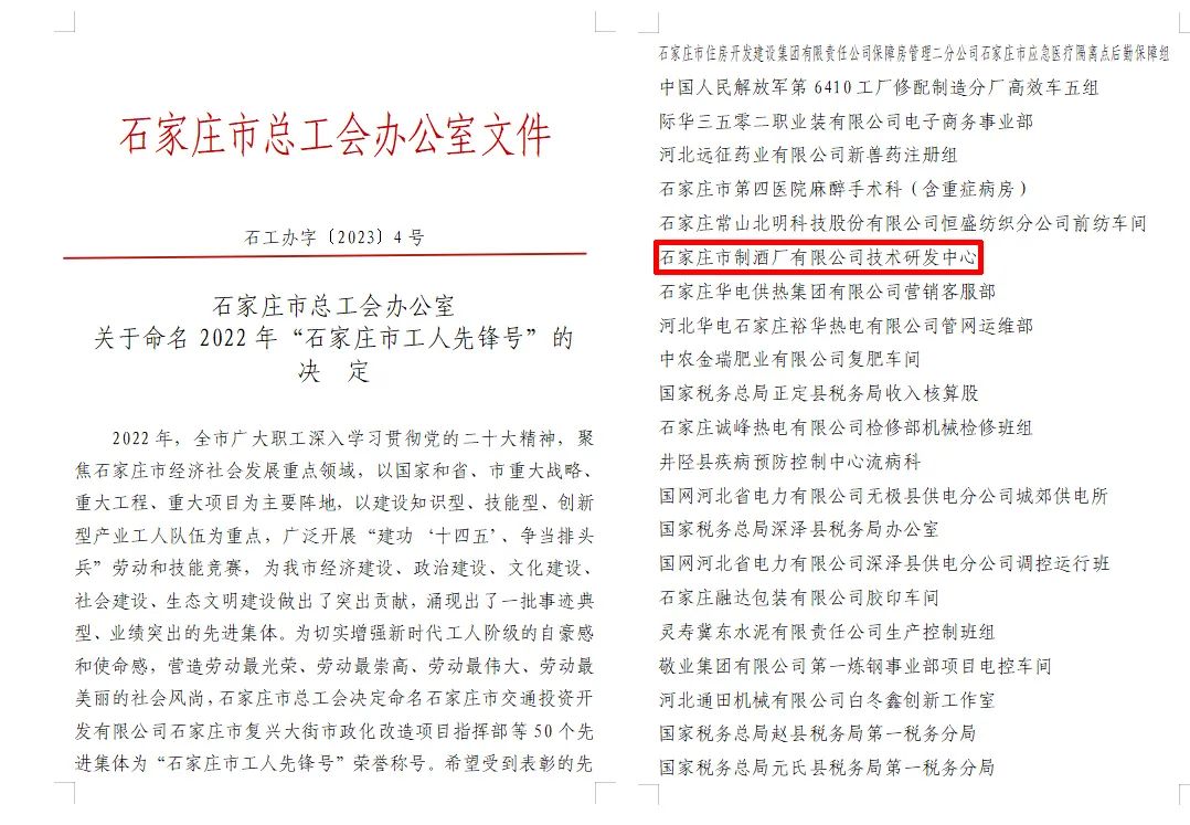 近日,石家庄市总工会办公会印发了《关于命名2022年“石家庄市工人先锋号”的决定》的通知,国投集团所属石酒公司技术研发中心被授予“石家庄市工人先锋号”荣誉称号。