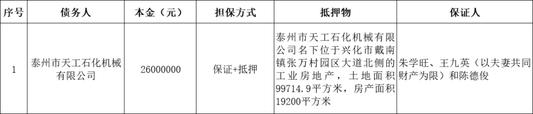 中国中信金融资产管理股份有限公司江苏省分公司拥有对泰州市天工石化机械有限公司不良债权,债务人所在地为泰州市。截止公告日,债权本金合计26000000元,相应的利息、罚息、费用、迟延履行金等以相关合同约定及生效法律文书确认为准。该户债权担保方式为保证和抵押担保。保证人为朱学旺、王九英(以夫妻共同财产为限)和陈德俊。抵押物为泰州市天工石化机械有限公司名下位于兴化市戴南镇张万村园区大道北侧的工业房地产,土地面积99714.9平方米,房产面积19200平方米。我司拟对上述债权进行处置,现予以公告。