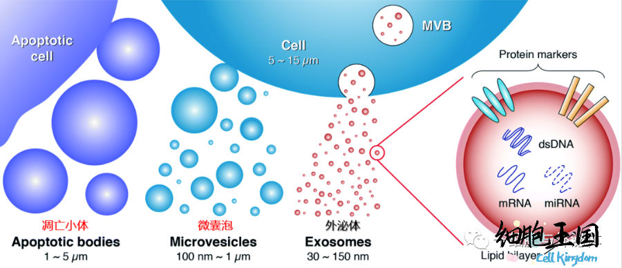 细胞外囊泡 ( extracellular vesicles, EVs)是机体远距离细胞间交流的一种手段。目前主要被分为3大类:外泌体、微囊泡和凋亡小体,临床研究中主要关注的是外泌体。外泌体就是细胞外囊泡的一种。自此,外泌体研究成为国际研究热点。
