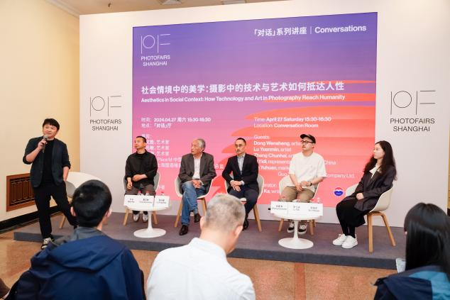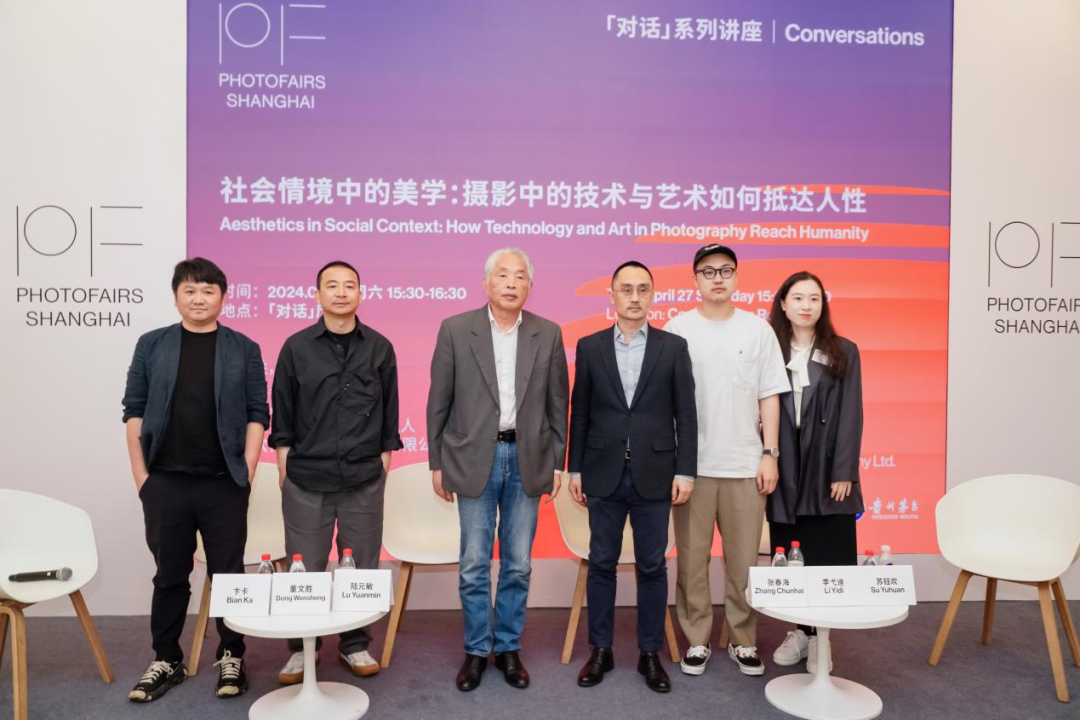 本次”水行千里“贵州茅台艺术展参与了2024影像上海艺术博览会”对话“栏目,以《社会情境中的美学:摄影中的技术与艺术如何抵达人性》为题。4月27日下午3点半-4点半,由策展人卞卡先生主持,参展艺术家董文胜、陆元敏、张春海,Place M中国主理人李弋迪、上海国酒缘贸易有限公司市场总监苏钰欢,共同参与对谈,对话厅内座无虚席。