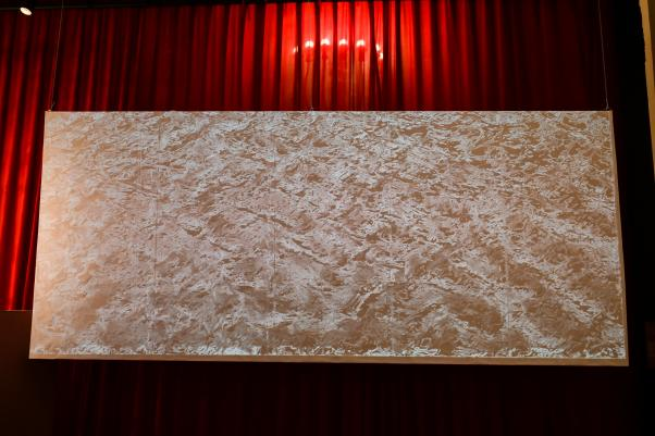 曲面墙体、悬挂的红色曲线造型,流线型的杜邦纸,都呼应着”水“与”江河“的主题,并将展览分为茅台故事和艺术家作品两个子空间。