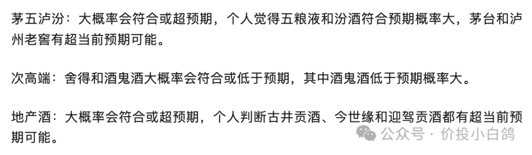 之前总结说过个股预测大部分人都是根据机构预测范围猜个数,用处不大,所以我一般会根据机构预测和当前股价对应增速做预期预测,大部分还是比较好预测到的,可以看出趋势就可以,之前预测如下:白酒周总结(20240419)