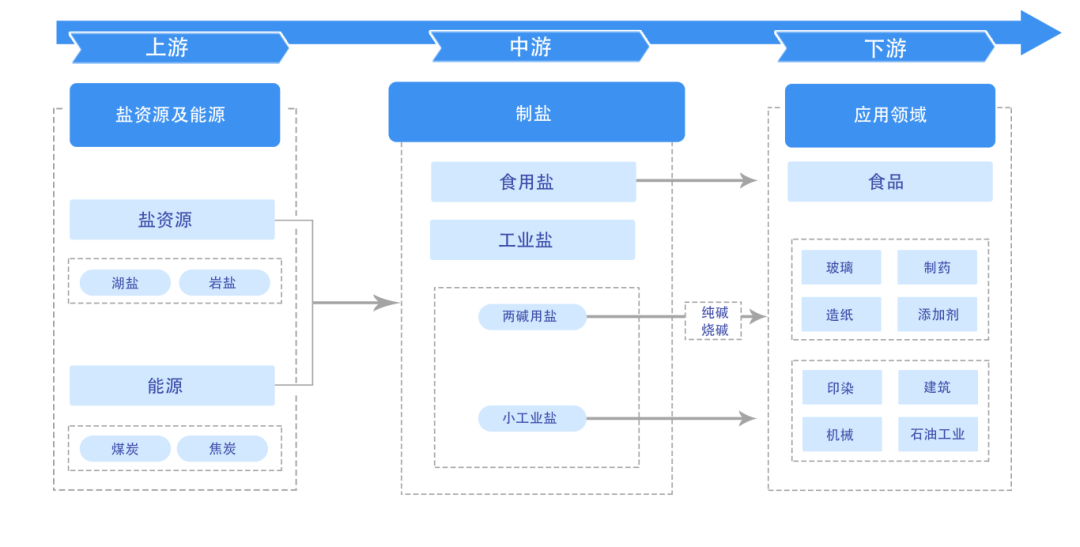 盐产业链可以分为上游的盐矿勘探和开采,中游盐的提纯和加工,下游盐制品的生产和销售。其中,上游的盐矿勘探和开采质量产量直接影响到后续环节,中游盐的提纯和加工涉及到多种技术和工艺,是盐产业链的核心部分。下游的盐制品生产和销售则涉及到食品加工、化学品制造、冶金和纺织等行业。