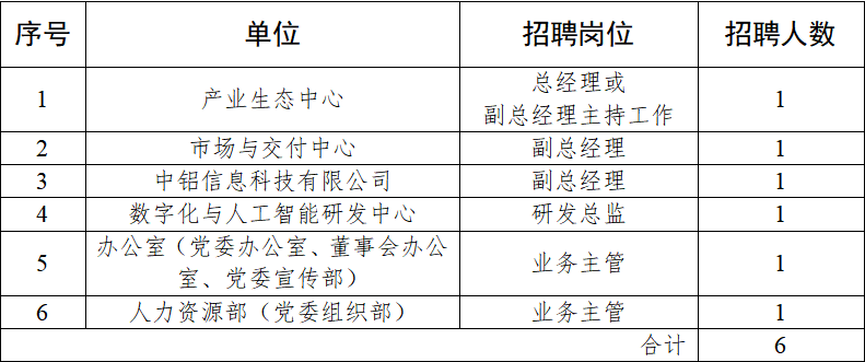 中铝智能科技发展有限公司(简称中铝智能)是中国铝业集团有限公司(简称中铝集团)全资子公司,是中铝集团数字化转型的承载主体,主要业务包括应用软件、云计算、信息安全技术的开发及技术服务;计算机信息系统集成及相关服务;智能装备、自动化设备、检测设备、仪器仪表、机器人的研发及技术咨询服务;数字化系统运维服务;数字化项目实施等。根据工作需要,现面向社会公开招聘中铝智能部分岗位人员,现将有关事项公告如下: