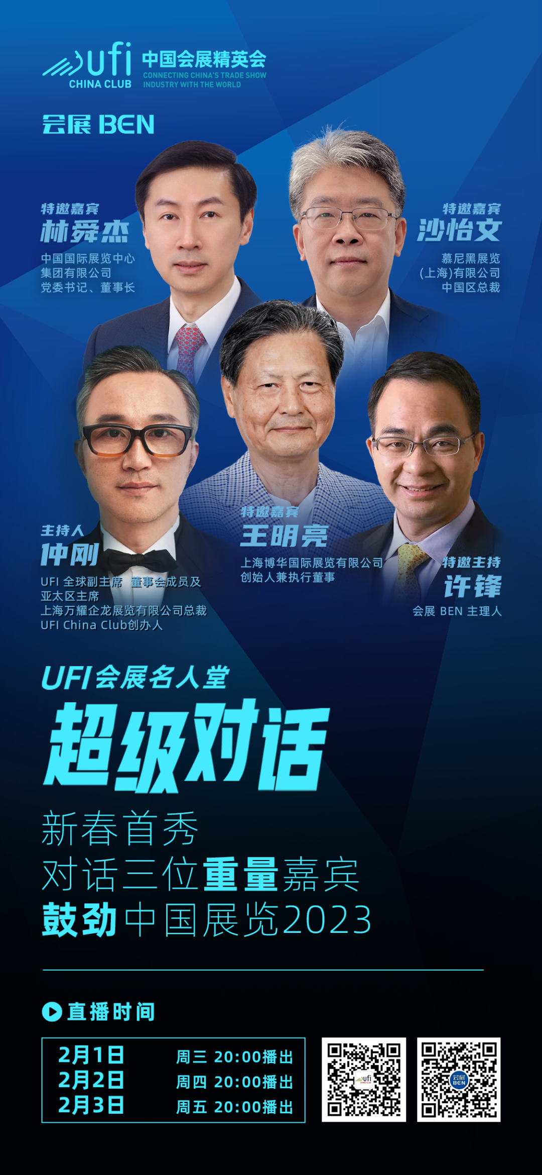 为此,UFI中国会展精英会和会展BEN首次合作,延续“UFI会展名人堂@超级对话”云活动,将于2月1日、2日、3日连续3天直播“UFI会展名人堂@超级对话”,特别邀请三位行业大咖: