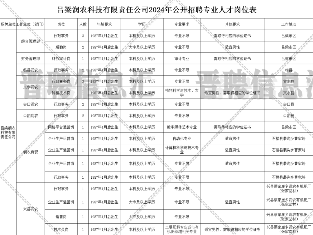 吕梁润农科技有限责任公司是一家专注农业产业的大型国有企业。为进一步强化经营管理和推动业务发展,公司面向社会公开招聘工作人员,根据《吕梁市属国有企业招聘人员管理暂行办法》等有关规定,现将招聘事项公告如下:综合管理部5人,财务管理部1人,子公司19人(其中,临县子公司2人,文水子公司4人,交口子公司2人,中阳子公司2人,兴县子公司4人,润农商贸公司5人),共25人(具体要求详见附件1)。2.年龄要求:年龄在18周岁至37周岁;(出生时间为1987年1月1日-2006年12月31日)6.在公务员招考中或事业单位招聘考试中被认定有舞弊等严重违反考录纪律行为的;通过“吕梁人事人才网”发布公告。(网站:https://www.llrc.com.cn/)报名时间:2024年5月6日8:00--5月10日18:00报考人员须在规定时间,如实填写《吕梁润农科技有限责任公司应聘人员报名登记表》(附件2)。在规定时间内将填好的《吕梁润农科技有限责任公司应聘人员报名登记表》扫描件以PDF格式发送至邮箱:llrnkj@sina.com,邮件主题为“姓名-单位(部门)-岗位-联系电话”。同时上传本人近一年内2寸红底免冠正面电子照片(30kb以内,JPG格式)。报考人员只能选择同一单位(部门)的一个岗位进行报名,重复报名者将被视为无效报名,取消报考资格;报名与考试时使用的本人有效居民身份证必须一致。提供虚假报名信息的,一经查实,立即取消报考资格。所造成的一切损失由报考者本人承担。初审时间:2024年5月7日8:00--5月11日18:00招聘领导组对报名人员的资格条件进行初审。通过资格初审人数与岗位招聘人数比例原则上应达3:1以上,招聘计划人数不达3:1的,要相应减少招聘计划,使报考人数与计划招聘达到3:1,如计划录用人数减少到1名仍不达到3:1的,按实有人数确定笔试人选。考试包括笔试、面试两部分,考试委托第三方机构组织实施。笔试内容为公共基础知识(50%)和岗位所需的相应专业知识(50%)。笔试时间120分钟,满分100分。笔试成绩保留两位小数,笔试最低合格分数线为60分(含60分)。参加考试时,考生须同时持有《笔试准考证》和与报名时一致的本人有效居民身份证,两证不全的不得参加考试。(身份证过期,丢失的请及时到公安机关办理临时身份证)准考证领取:参加笔试人员凭本人身份证领取笔试准考证,严禁代领,逾期视为放弃笔试(笔试准考证领取时间、地点在笔试公告中发布)。招聘领导组按照笔试成绩从高分到低分的顺序,按招聘计划3:1的比例确定参加资格复审的人选,不达比例的按实有人数确定。取得资格复审的人员确认放弃资格复审或资格复审不合格形成的缺额,在同一单位(部门)的同一岗位笔试成绩依据从高分到低分的顺序,等额依次递补资格复审人选,递补时,出现笔试成绩并列的,并列者同时确定为资格复审人员,递补只进行一次。资格复审人员名单、时间及地点在吕梁人事人才网公布。(1)《吕梁润农科技有限责任公司应聘人员报名登记表》(彩色正反打印一式三份,并在本人承诺部分签字);(2)本人有效居民身份证、户口簿(首页及本人页)原件及复印件(一式三份);(4)通过学信网下载的《教育部学历证书电子注册备案表》学历证明;通过中国学位与研究生教育信息网下载的《教育部与研究生发展中心认证报告》学位证明;(6)复审时暂未取得相应学历和学位证书的2024年应届毕业生,需提供学校出具的学历学位证明,说明入学及毕业时间、所学专业、是否可如期毕业及按期取得学历、学位证书,并在2024年8月31日前取得相应的学历和学位证书。面试方式:采取结构化面试,面试时间10分钟,满分100分。主要考察应聘者的综合分析能力、语言表达能力、组织协调能力、人际沟通能力、决策能力、应变能力等方面。面试成绩最低合格分数线为70分(包括70分,面试成绩保留两位小数),否则不能进入体检、考察等环节。考试综合成绩=笔试成绩×60%+面试成绩×40%,考试综合成绩最低合格分数线为60分(四舍五入保留两位小数)。招聘领导组按照岗位招聘计划,考生考试总成绩从高分至低分按照1:1的比例确定体检人员。体检由领导组办公室统一组织,时间、地点等事宜将通过吕梁人事人才网网站发布。体检费用由本人自理。体检标准参照《公务员录用体检通用标准(试行)》。对体检不合格或放弃体检资格出现空缺名额的,不进行递补。领导组办公室将电话通知进入考察环节的考生,请考生保持通讯畅通。考察采取实地调查等形式进行,主要对应聘者的思想政治表现、道德品质、遵纪守法情况、主要社会关系以及工作经历等进行综合考察,不合格者或不按规定参加考察者,取消其聘用资格。对拟录用人员名单通过吕梁人事人才网网站进行公示,公示期为7个工作日,公示期满无异议的,按规定办理入职手续。1.应聘人员应对所提交材料的真实性、准确性负责。如发现与事实不符,取消应聘资格。2.应聘人员在报名招聘期间须自觉做好自身健康管理。因个人原因造成无法应聘的,后果由本人承担。3.公开招聘不委托任何机构举办考试辅导培训班,也不指定任何参考用书和资料。应聘者要提高警惕,谨防上当受骗。联系人:张女士18135425970 李女士15834394969