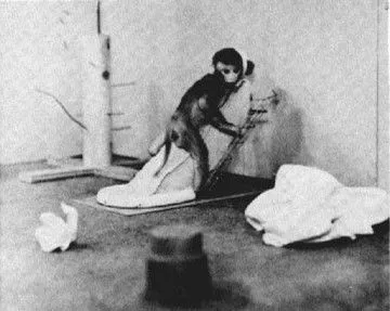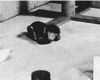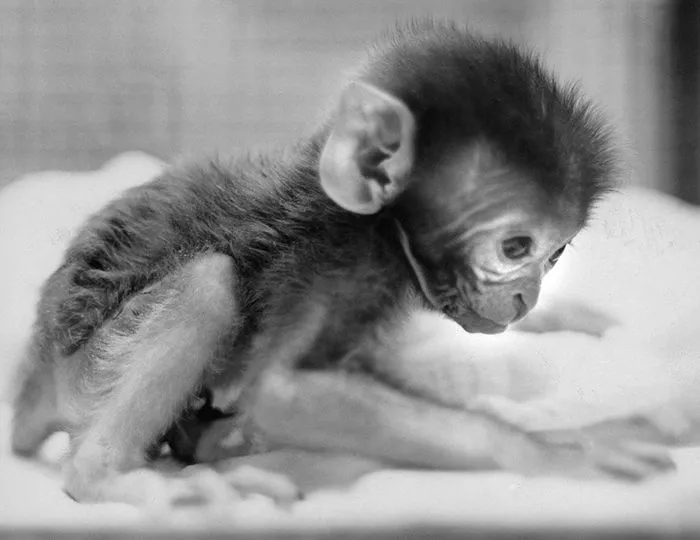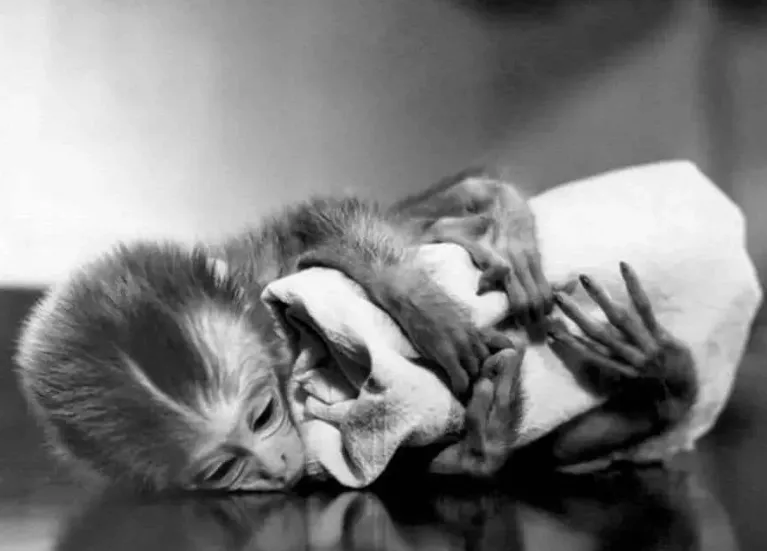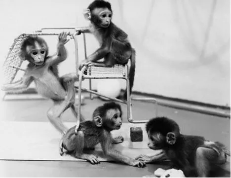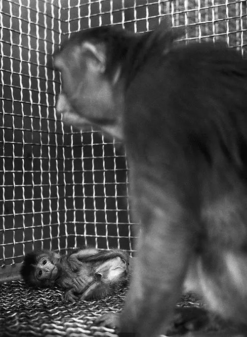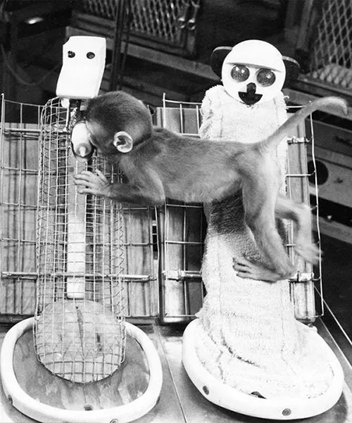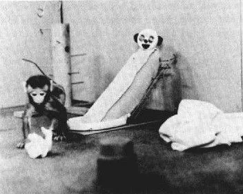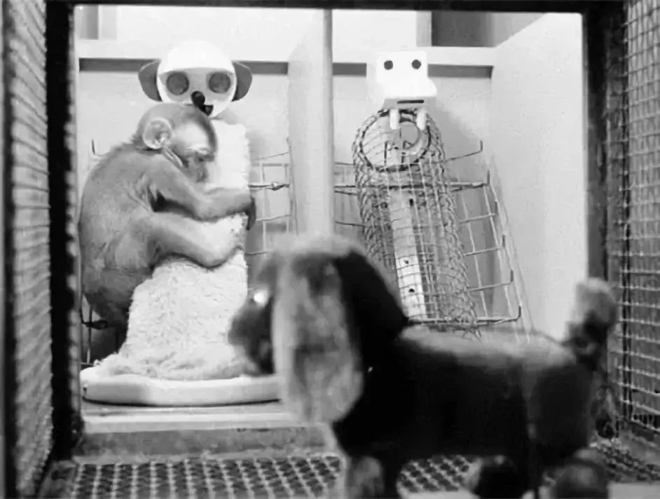 当哈洛将 “绒布妈妈” 拿走后,幼猴就会抱头缩在墙角,表现出非常害怕的样子,给再多玩具也不要。