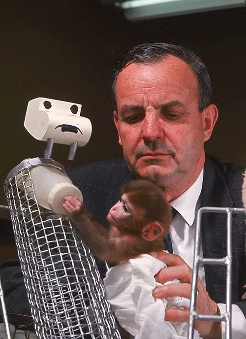 作为一名心理教师,我经常给老师和家长们做关于心理学和家庭教育指导的讲座,经常给他们讲孩子在成长过程中需要的心理营养和依恋关系。每次提到孩子的养育,我就会想起那些为之探索和研究的心理学家以及他们的实验。上世纪三四十年代,美国心理学家、行为主义心理学创始人华生,提出了一个非常著名的理论:“孩子对爱的需求,源自于他对食物的需求,满足了他对食物的需求,就满足了他对爱的需求,所以母亲只需要给宝宝提供足够食物就可以了。母亲不能和孩子过度亲密,过度亲密会阻碍孩子的成长,使孩子在成人后非常依赖母亲,从而难以独立难以成才。”华生为此还专门写了一本书 ——《婴儿和儿童的心理学关怀》。“要把孩子当作机器一样训练和塑造:得像对待成人那样对待孩子,尽量不要亲吻和拥抱孩子,不要让孩子坐在母亲大腿上,不要轻易地满足孩子,就算孩子哭泣,也决不能心软,以免他们养成依赖父母的恶习……”这套理论在上世纪三四十年代,风靡了整个美国,接着又影响了西方多个国家。后来流行的哭声免疫法、延迟满足法、婴儿独立睡眠法等,其核心思想皆源于此。这个人就是 —— 哈里·哈洛(Harry Harlow)。恒河猴 94% 的基因和人类相同,它对外界刺激所做出的反应,和人类非常类似或相近。哈洛把刚出生婴猴放进笼中,然后用两个假猴子代替母猴。一个假猴是用铁丝做的,胸前安装了一个奶瓶,可以 24 小时提供奶水。如果按照华生 “有奶就是娘” 的理论 —— 孩子对爱的需求,源自于他对食物的需求,满足了他对食物的需求,就满足了他对爱的需求。但实验结果出人意料,所有参与实验的婴猴,都选择了没有奶瓶的 “绒布妈妈”。几乎在所有时间里,小猴都会挂在 “绒布妈妈” 身上,只有感到饥饿难耐时,它才会跑到 “铁丝妈妈” 那里吃奶。但只要一吃饱,它就会迅速回到 “绒布妈妈” 怀里。有的小猴甚至饿了也不愿过去,它们把身子挂在 “绒布妈妈” 身上,只把头探到 “铁丝妈妈” 那边吃奶。他制作了一些发条玩具,比如恐怖的大蜘蛛、会敲鼓的小熊等,然后将它们放进笼子里。小猴害怕极了,立即奔回去抱住 “绒布妈妈”,趴在妈妈怀里,慢慢地安静下来。哈洛又将 “绒布妈妈” 移到另一间房间,然后用发条玩具继续恐吓。小猴更加害怕了,但即使再害怕,它也不奔向 “铁丝妈妈”,而是眼巴巴地望着另一边的 “绒布妈妈”。