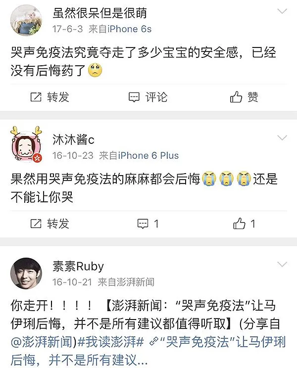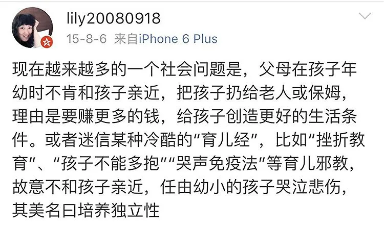 ● 独立并不是 “孤立” 和 “狠心” 培训出来的。恰恰相反,得到细心呵护、温柔拥抱、及时回应的孩子,孩子反而更容易离开妈妈怀抱去独立探索,成为更加独立、更能适应社会的人。● 越是得到爱抚和疼爱的孩子,就越会敞开内心,变得开朗。而越是得到关注少的孩子,就越是会封闭自己的内心,漠视周围环境,孤僻不合群。为了继续探索母爱缺失可能引发的问题,哈洛又做了一个实验 —— 长期缺母实验。一群小婴猴出生后,哈洛不让它和任何假妈妈接触,就让它们孤独地呆在笼子里,只是定时地给予食物。在小猴 “无母” 地生活 8 个月之后,哈洛将它们放进了拥有 “绒布妈妈” 和 “铁丝妈妈” 的房间里。结果它们不会奔向任何一个妈妈,因为它们从来没有跟妈妈相处的经验。它们大都抱着自己,摇摆身子、瘫倒在地,然后发出绝望的尖叫声。而更可怕的是,这些小猴长大后,完全无法融入猴群,非常胆小、非常惧怕其他猴子,同时具有非常强的自残性和攻击性。当其他猴子欺负它们时,它们就开始自残,撕扯自己的毛,咬自己的胳膊和腿。(和我们现在的一些学生有没有很像)幼猴在出生后,一旦跟母亲分离超过 90 天,这种伤害就无法弥补,即使此后再跟母亲或其他伙伴相处,也永远无法成长为正常的猴子,因为某个 “关键期” 被错过了。一旦错过,那扇门就被永远地关闭了,情感纽带便再也无法建立。于是哈洛得出了结论 —— 孩子出生之后的6 个月,是建立良好母爱的最重要时期。因为小猴的 90 天,差不多就是人类的 6 个月。“孩子出生后,父母特别是母亲,要避免与孩子的长期分离。长期分离会对孩子造成巨大伤害。”最后,哈洛做了一个非常残忍的实验,这个实验叫 ——绝望之井。哈洛制造了一个个漏斗型小黑屋,让小猴们头部朝下吊了两年,底部有个容器可以获取食物。刚开始的时候,小猴会不断顺着峭壁往上爬,但发现无法逃离后,便孤独绝望地安静了下来。两年后,将小猴放出来时,它们已经得了重度抑郁症。喜欢远离猴群,呆呆地坐着,完全失去了猴子应有的活力,且拥有极强的自闭、自残和攻击倾向。哈洛试过很多药物和利用集体生活对它们进行治疗,但都没能得到多大的改善。哈洛由此得出结论 —— 从这些小猴身上,我看到了人类最惨重的精神疾病是怎么来的。“对灵长类动物来说,早期严重而持久的孤立,会导致孩子心理残伤和死亡,这种影响直至终生。”攻击性,并非天生,而是因无回应的绝境而生。严重缺乏回应的婴儿,内心会产生两个激烈情绪:哈洛的这一系列实验,因为非常残酷残忍,受到了很多人的批评和斥责,但这一系列实验的贡献实在是太大了,它扭转了风行欧美的育婴方式。所以哈洛的恒河猴代母实验,后被誉为 “20 世纪最伟大的心理学实验”。殊不知,孩子在幼年时期,如果没有得到足够的触摸、运动和玩耍,长大后往往性格内向,不合群、抗压能力差,自我价值感低,社交能力比较弱,甚至会抑郁、自闭、自残和充满攻击性。现在的父母都喜欢说一句话 —— 不让孩子输在起跑线上。但大部分父母并不知道,真正的起跑线其实在婴儿时期。对孩子真正的富养,不是给最多的钱,不是给最好的食物,而是给最多的陪伴。《柳叶刀》有一个调查,结果显示:中国抑郁症患者已达 9400 万。2016 年,中国疾病预防控制中心发布了一个数据:中国每 13 人中就有 1 个精神障碍患者,中国青少年自杀率已经排在了世界第一。抑郁症的成因虽然非常复杂,自杀的原因也涉及多个方面,但毋庸置疑,其中极为致命的一个成因,就来自于 “婴童” 和 “幼年”。