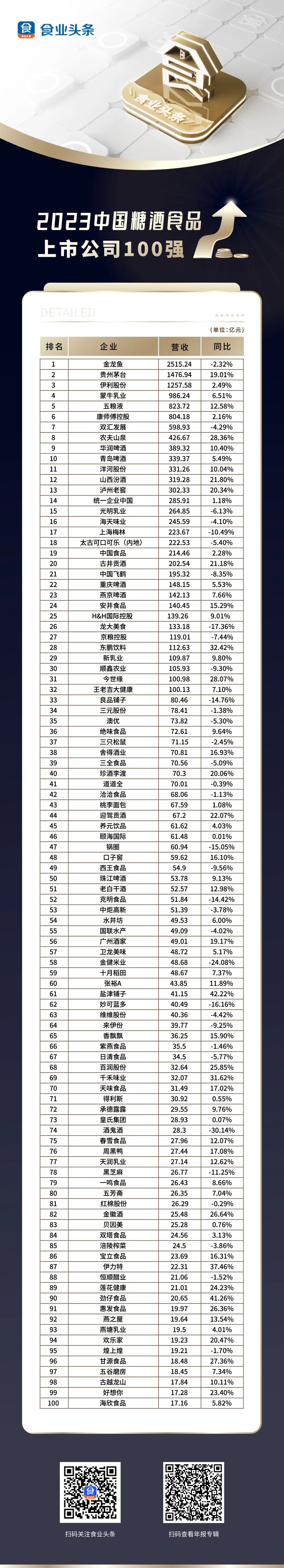 新鲜出炉!食业头条发布《2023中国糖酒食品上市公司100强》