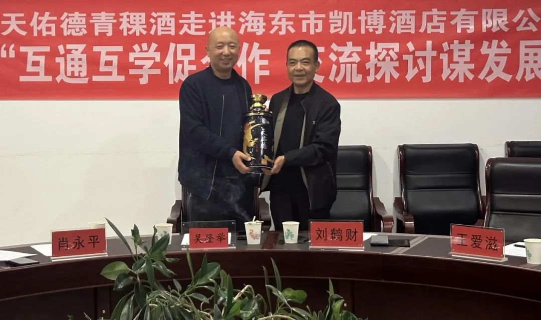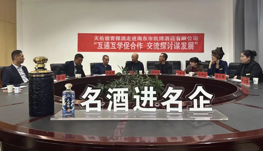 4月17日,天佑德青稞酒公司走进海东市凯博酒店有限公司,开展以“互通互学促合作 交流探讨谋发展”为主题的交流活动。海东市凯博酒店有限公司店长魏兰青,主管经理应秀珍及公司相关领导同天佑德青稞酒公司营销中心海东大区总监刘鹤财,营销中心散酒业务部部长王力,乐都办事处营销经理王兴邦,海东恒庆博商贸有限公司经销商肖永平共同参加此次交流活动。