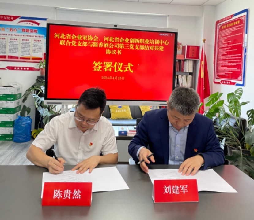 4月25日,酱香酒公司第三党支部与河北省企业家协会、河北省企业创新职业培训中心联合党支部开展党建共建签约仪式。河北省企业家协会、河北省企业创新职业培训中心联合党支部书记刘建军出席活动。