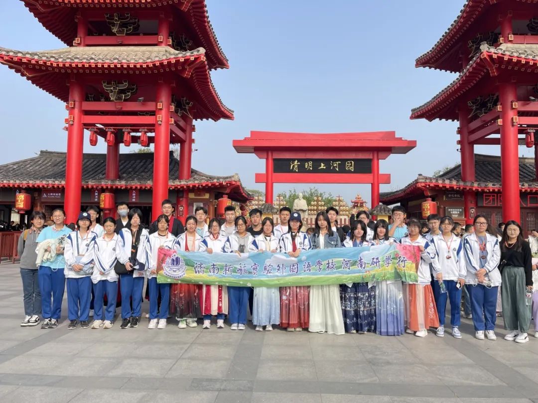 在研学过程中,学生们参观到了清明上河园内的各个景点,包括虹桥、街景、店铺、河道、码头等,了解宋代都市的建筑风格、城市规划和社会生活。同时,他们还观看了各种民俗表演,如气功喷火、岳飞枪挑小梁王等,感受到了宋代民间文化的独特魅力。