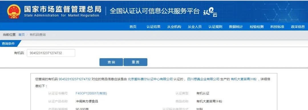 可查到:有机产品名称、认证证书编号、获证企业等信息。