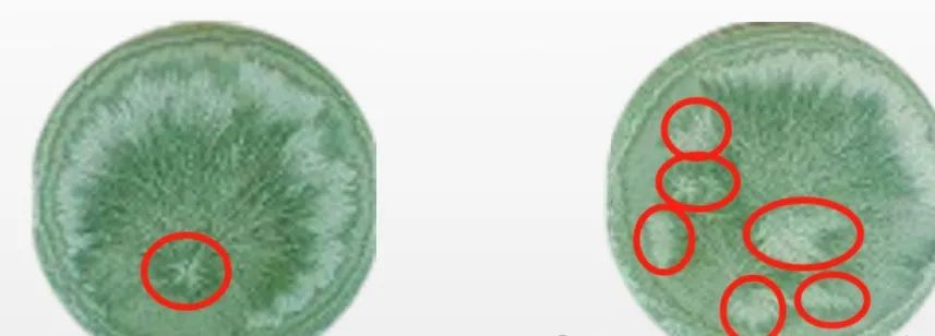 经氯化铜电子结晶法染成绿色后,电子显微镜放大3000倍,看到的单个细胞,左图是有机食品,单个细胞中有一个细胞核;而右边是常规食品,单个细胞中竟然出现了6个细胞核!