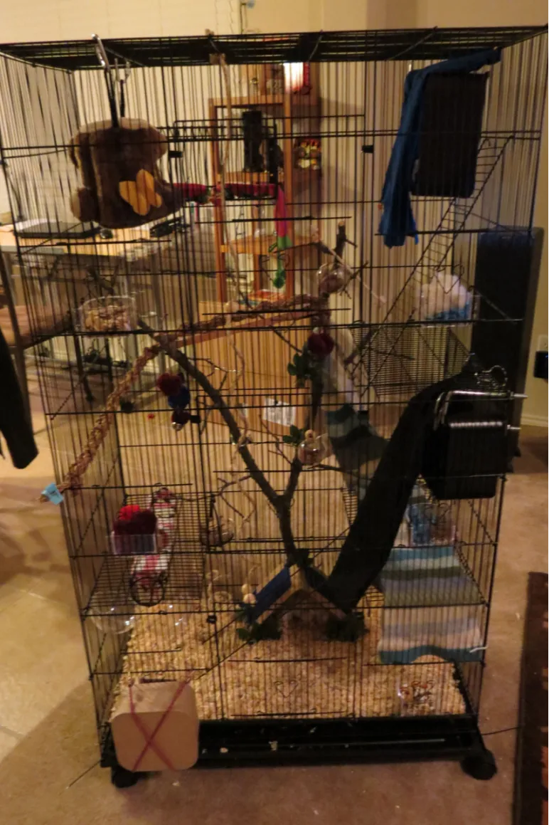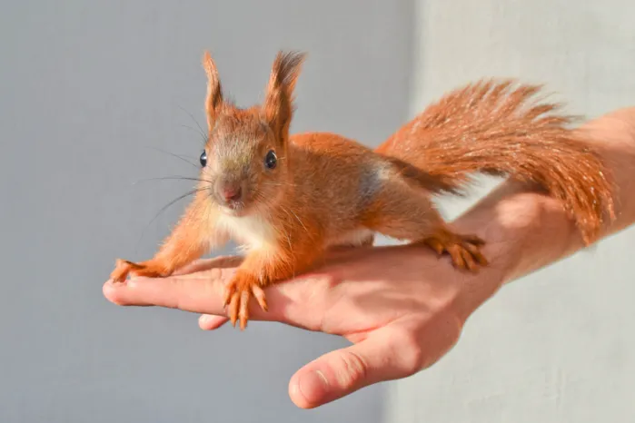 作为小宠,我们还是需要为松鼠准备一个单独的、安全的、舒服的新家。松鼠喜欢攀爬、玩耍和隐藏。笼子至少要一米高、半米宽以上的大笼子,足以让松鼠可以充分上下活动,并且从习性来说,松鼠的笼子越高越好。材质的话选择金属制的网丝笼最好,这样它们既不能越狱,也不会因为啃食笼子材质吃下异物。笼子的摆放位置最好接近窗边或者不是全天暴晒的阳台上,好让它们能更多接触自然环境。喂养宠物松鼠的最佳策略是与它们在野外吃的食物相匹配,包括松果、种子、蘑菇、花朵和花蕾、浆果、橡子、核桃、胡桃等各种野外食谱。但我们很难做到找来这么多野外食物。因此常见的啮齿动物食块+少量水果+昆虫类(比如面包虫、蟋蟀)就可以。松鼠是机会主义的小家伙。它们会吃任何能吃的东西。所以把控它们的食物健康的责任就落在主人的身上。虽然松鼠确实喜欢人类食物,包括蛋糕、零食和其他加工食品,但这些对松鼠来说并不健康,会导致肥胖和消化不良。另外要注意:限制种子、玉米和坚果的摄入。虽然给宠物松鼠喂大量种子、玉米和坚果很诱人,但它们并不是健康的选择,随着时间的推移可能会导致肥胖,过度食用也会增加代谢性骨病等营养失调的风险。将这些食物视为松鼠的小零食,在正餐之后给少量即可。松鼠也是需要每日补充水分的动物,用啮齿类宠物常用的饮水器,每日更换新鲜饮水就可以。松鼠的天性就是在树上活动,因此在笼内要搭一些攀爬的丰容道具,比如经过处理的干净的树枝,鸟类常用的栖架等就是不错的选择。此外,笼内要在不同高度放一些可以让松鼠躲避栖身的容器,鸟类用的巢箱就很合适。并需要根据气温提供纳凉或者保暖的填充材质。这类材质的选择以不会让松鼠吃下去为优先,最好不要有特殊气味且不会掉毛屑。并且定期更换。作为啮齿动物,松鼠也是需要有啃咬玩具,可以选鸟类和其他啮齿类小宠的啃咬玩具,干净的带外壳的坚果也是很好的磨牙零食。相对于猫和狗来说,松鼠的体型毫无优势,因此如果家里有猫狗宠物的话,最好将松鼠与其他宠物分开,哪怕松鼠在笼子里。松鼠也是容易应激的动物,但是既然养了它们就要提前为未来很可能需要的去医院做一些适应性训练。和人类的接触是日常就要训练的,最好从3个月以后就逐步让它们适应出来活动、外出。