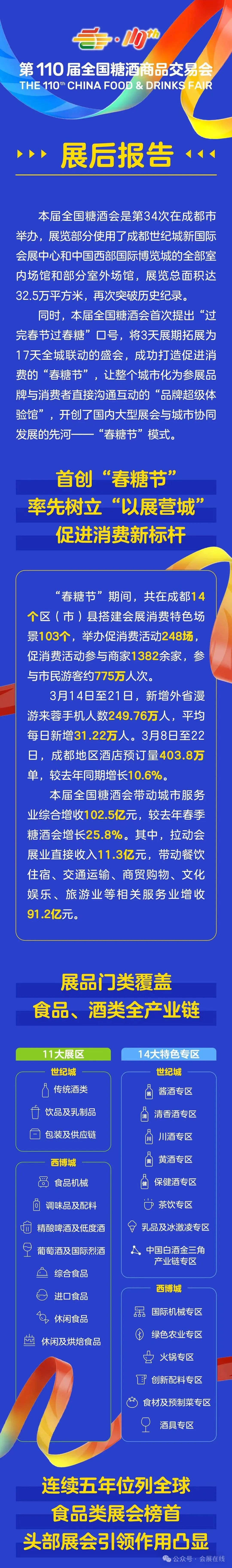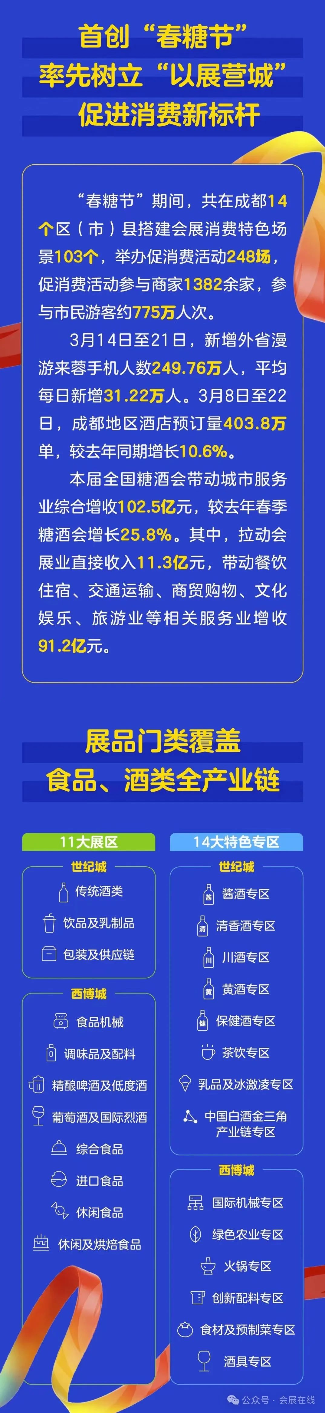 本届全国糖酒会是第34次在成都市举办,展览部分使用了成都世纪城新国际会展中心和中国西部国际博览城的全部室内场馆和部分室外场馆,展览总面积达32.5万平方米,再次突破历史纪录。同时,本届全国糖酒会首次提出 “过完春节过春糖”口号,将3天展期拓展为17天全城联动的盛会,成功打造促进消费的“春糖节”。让整个城市化为参展品牌与消费者直接沟通互动的“品牌超级体验馆”,开创了国内大型展会与城市协同发展的先河--〝春糖节” 模式。